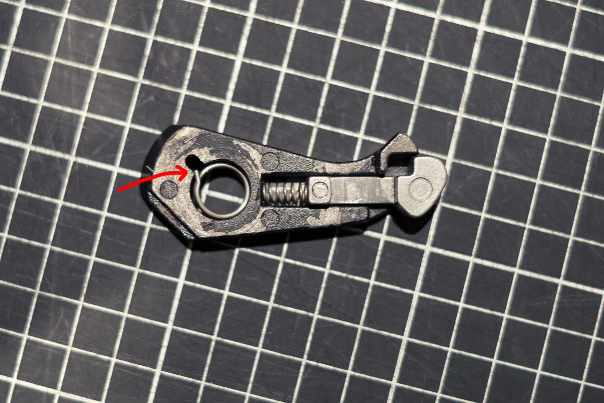 Firstly put the lower brass nut in the recess on the top plate then assemble the arm following the image below, taking care that the end of the spring is located in the recess (arrowed).