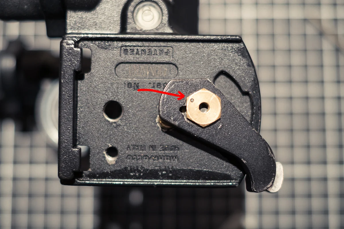 Like most Manfrotto tripod heads, the 410 Junior Geared Head (to give it it's full title) has a sprung brass pin that triggers the arm to close and llock the quick release plate (and camera) in place. This pin sits inside a hole in the top plate and over time as moisture seeps in these have a habit of corroding and as there isn't much clearance between the pin and the hole this causes it to get stuck... which is what happened to mine. Seems the rain and shine part might have been the problem.