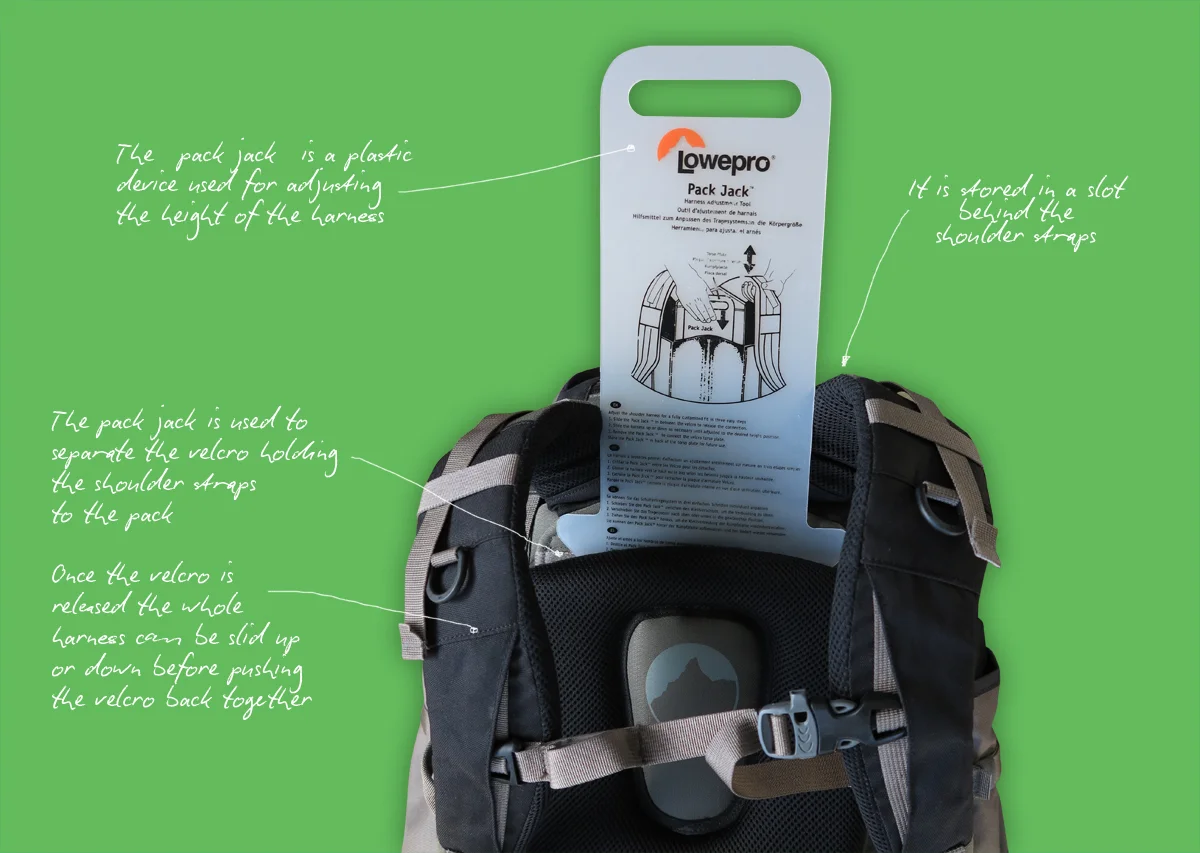 The harness is basically attached to the bag by a huge piece of Velcro and using a piece of plastic supplied ( known as the pack jack) the Velcro can be released and the straps slid up or down as required.